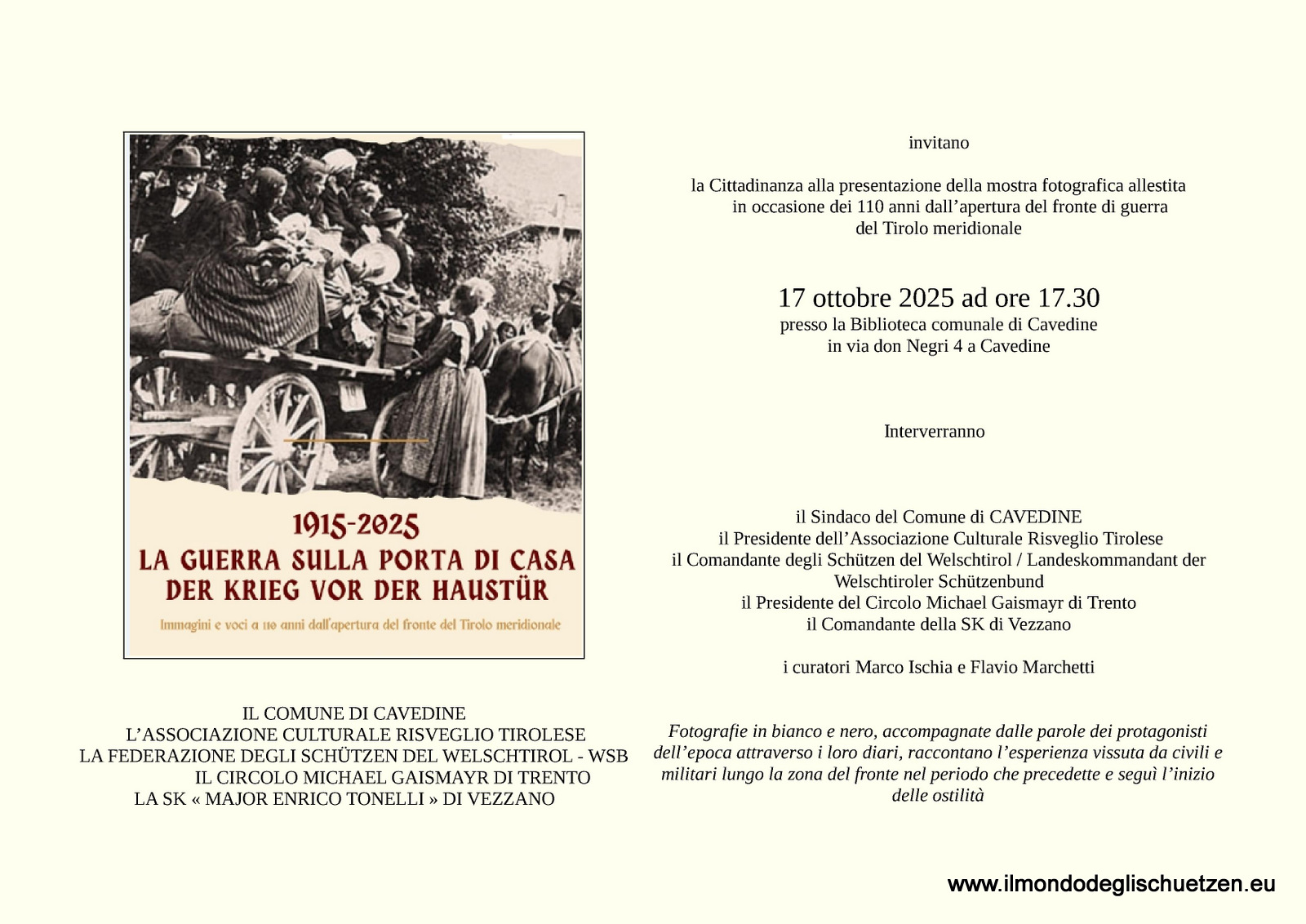 2025_05_30 Predazzo. Nella splendida sala della biblioteca comunale di Predazzo si è tenuta la presentazione della mostra “La guerra davanti alla porta - der Krieg von der Haustür”, curata da Flavio Marchetti e Marco Ischia ed organizzata dalla Federazione degli Schützen del Tirolo meridionale e da Risveglio Tirolese. Un grazie va rivolto all’amministrazione di Predazzo, presente con il Sindaco Paolo Boninsegna e l’assessora Leonilde Sommavilla, alla consigliera provinciale Maria Bosin, ai soci, membri del direttivo di Risveglio Tirolese, Carlo Simeoni, Alessandro Gaiotto e Walter Stefani, che hanno materialmente contribuito all’allestimento dei vari pannelli della mostra. Un grazie, naturalmente, anche al numeroso pubblico intervenuto. Si sono succeduti, in qualità di relatori, i già citati Flavio Marchetti, Maria Bosin ed Enzo Cestari, oltre a Paolo Monti, quest’ultimo in rappresentanza di Risveglio Tirolese. Scopo della mostra, che si è già tenuta nel corso del mese di maggio nella prestigiosa sede di palazzo Trentini a Trento, non è quello di raccontare un tassello della storia della prima guerra mondiale ma, a 110 anni dalla dichiarazione di guerra da parte dell'Italia all'Austria (24 maggio 1915) e dalla conseguente apertura del fronte del Tirolo meridionale, quello di ricostruire un tassello della storia delle popolazioni del Trentino/Tirolo meridionale, specialmente il dramma di tutti quelli che, da un giorno all'altro, si trovarono lungo la linea del fronte.