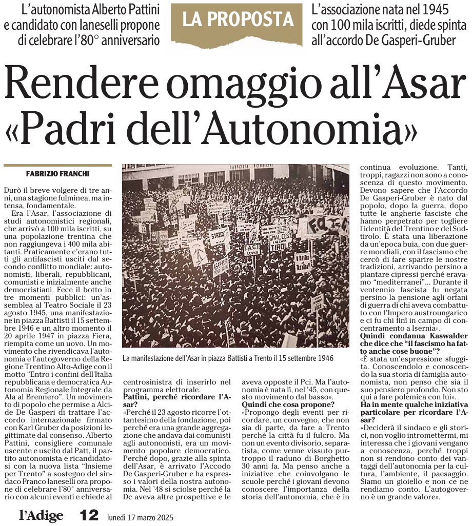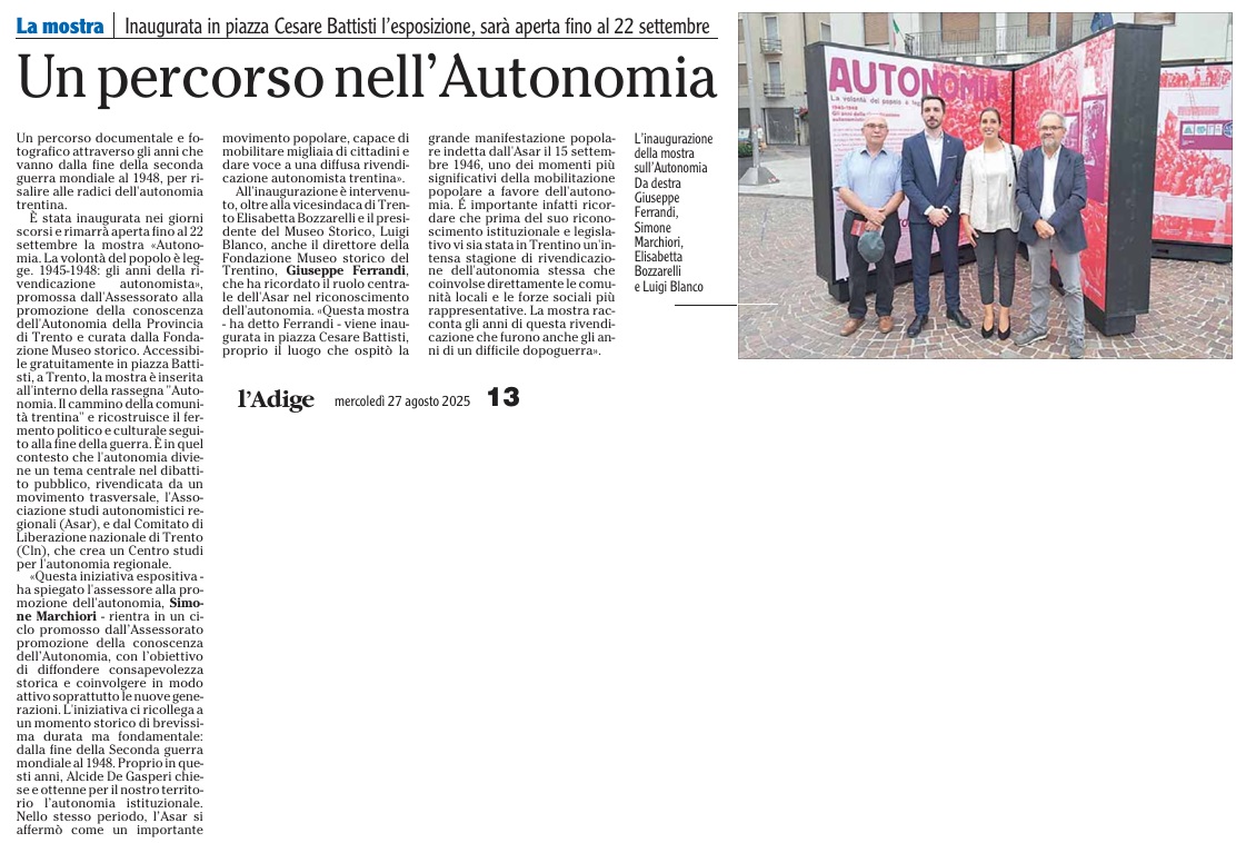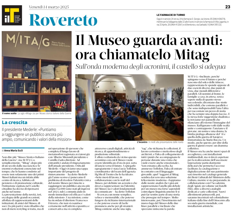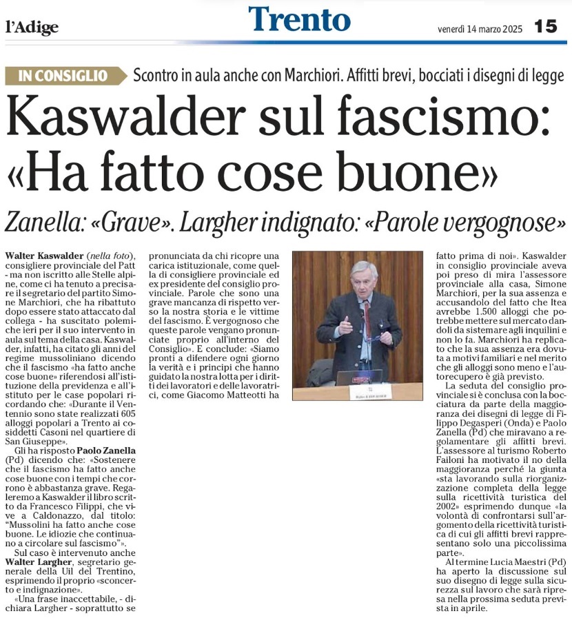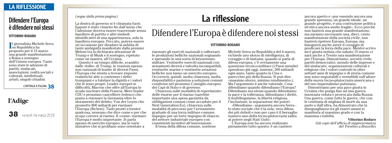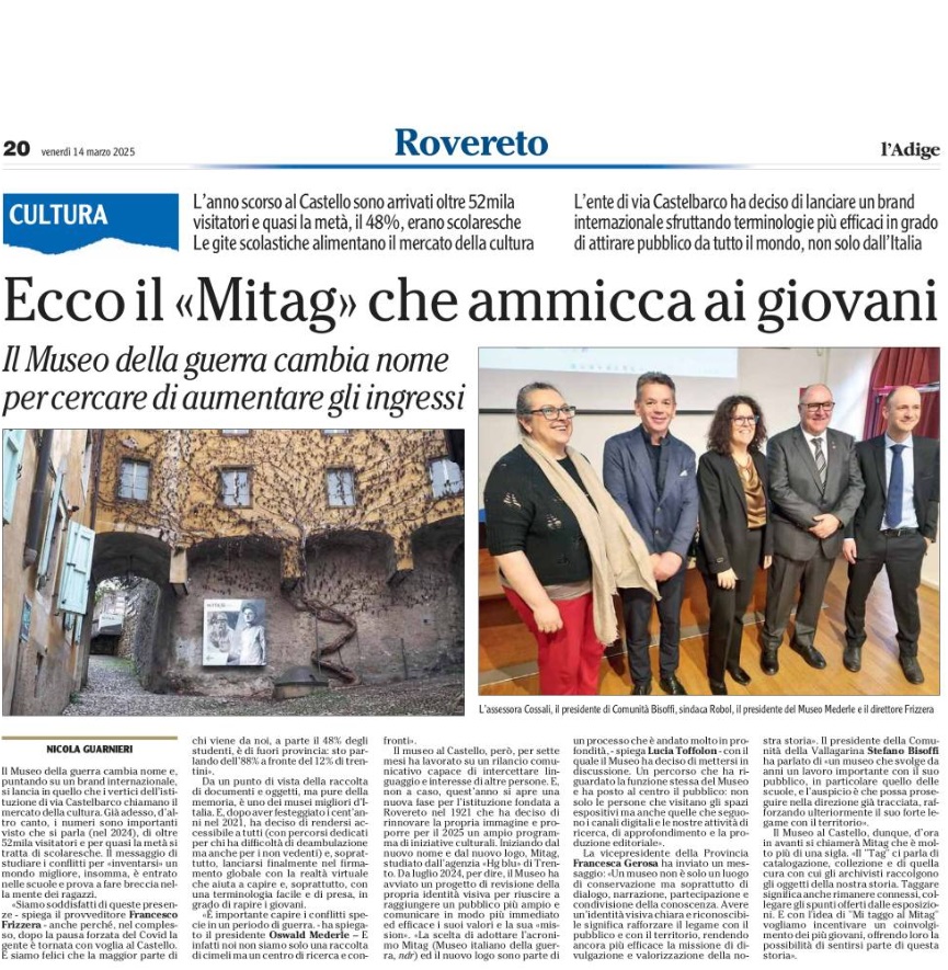 14 - 03 - A Lavis omaggio a Clara Marchetto - Comuni, la crisi ha radici lontane - Difendere l'Europa è difendere noi stessi - Ecco il Mitag che ammicca ai giovani - Il fascismo C'é del buono - Il Museo guarda avanti ora chiamatelo Mitag - Kaswalder sul fascismo Ha fatto cose buone