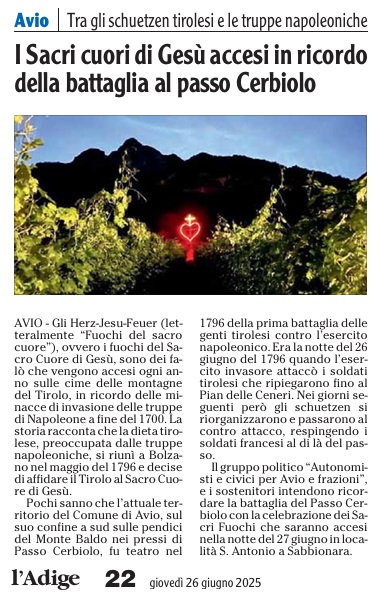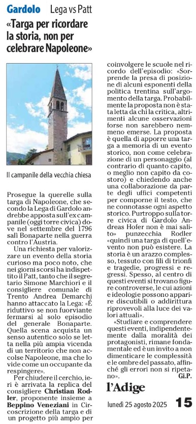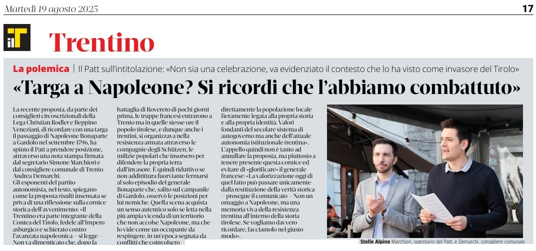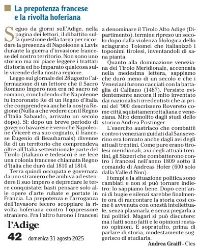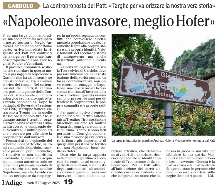 19 - 08 - Addio all'autonomista Livio Hoffer - Napoleone invasore, meglio Hofer - Olte 700 per il concerto dell' Avez del Prinzep - Pergine piange Livio Hoffer, autonomista ed ex consigliere - Targa a Napoleone Si ricodi che l'abbiamo combattuto