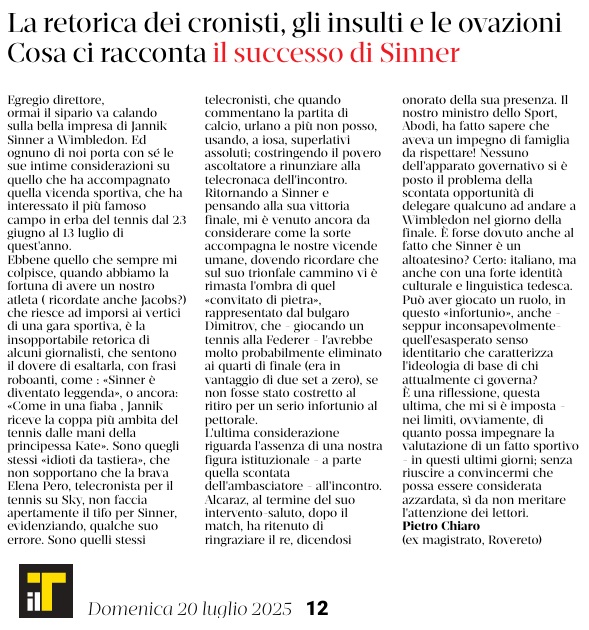 20 - 07 - Cosa ci racconta il successo di Sinner - Memoria e tradizioni 25 anni di servizio - Sinner e il governo assente ecco il perchè