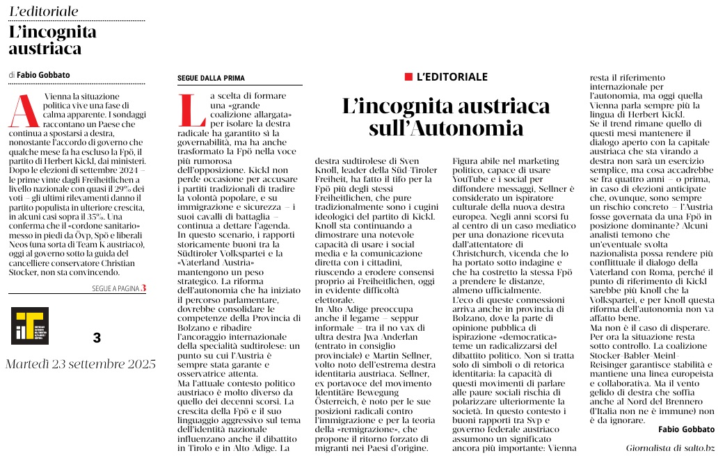09 - 09 - E se il Sudtirolo fosse uno Stato La scelta è politica - Nuove competenze, vecchi rischi L'Autonomia senza contrappesi - Raddoppiato in Austria il numero degli italiani