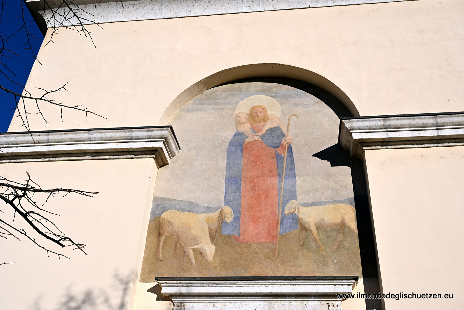 2025_11_23 SK Rovereto. A Santa margherita di Ala inaugurazione del ritrovato affresco sul frontale della chiesa raffigurante il "Buon Pastore che viene rappresentato come guida e salvatore dei fedeli assimilati al gregge". Santa Messa per la festa del ringraziamento, con benedizione dei prodotti della terra e dei trattori. Alla fine breve ricordo di tutti i caduti di tutte le guerre.